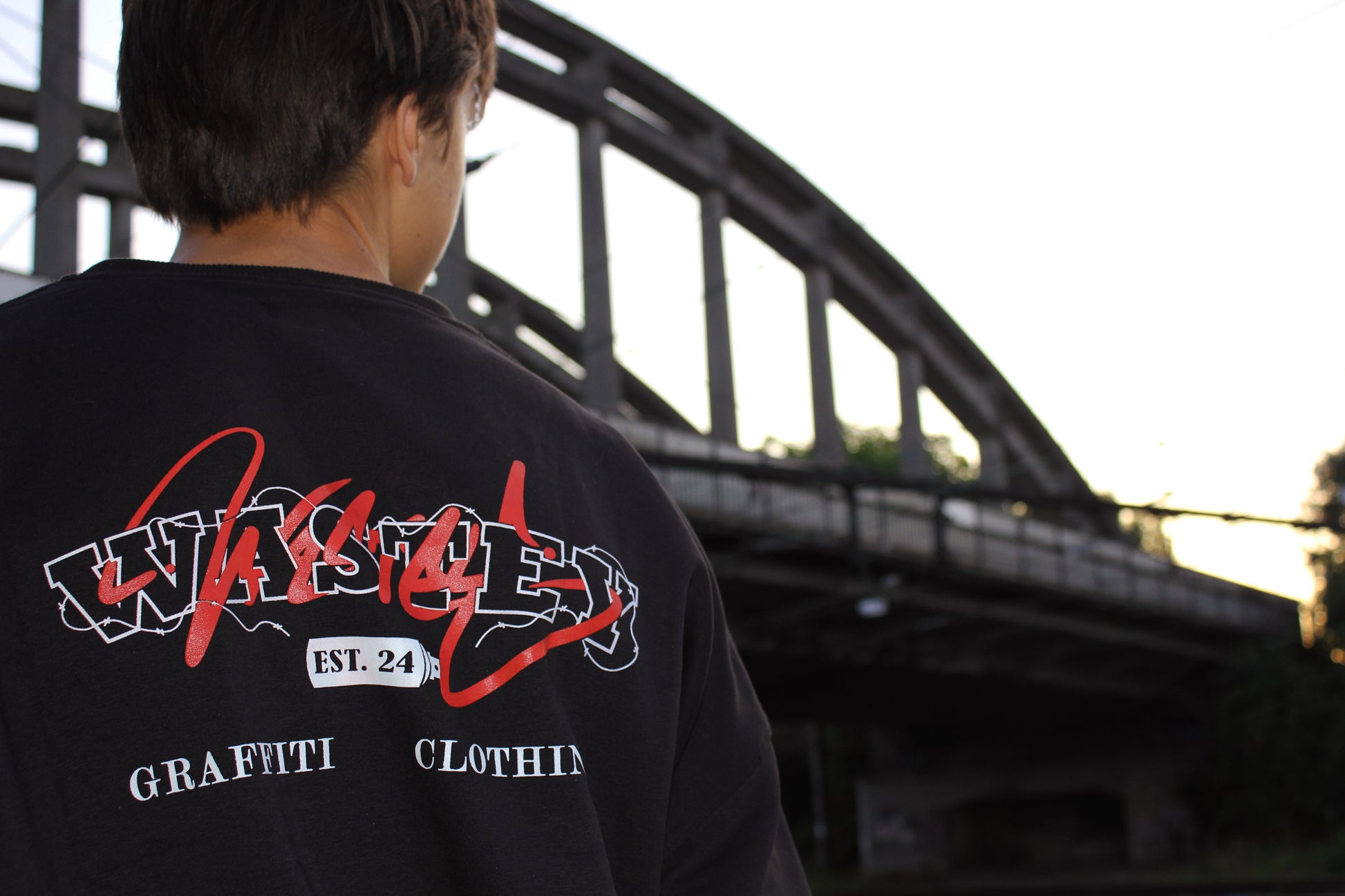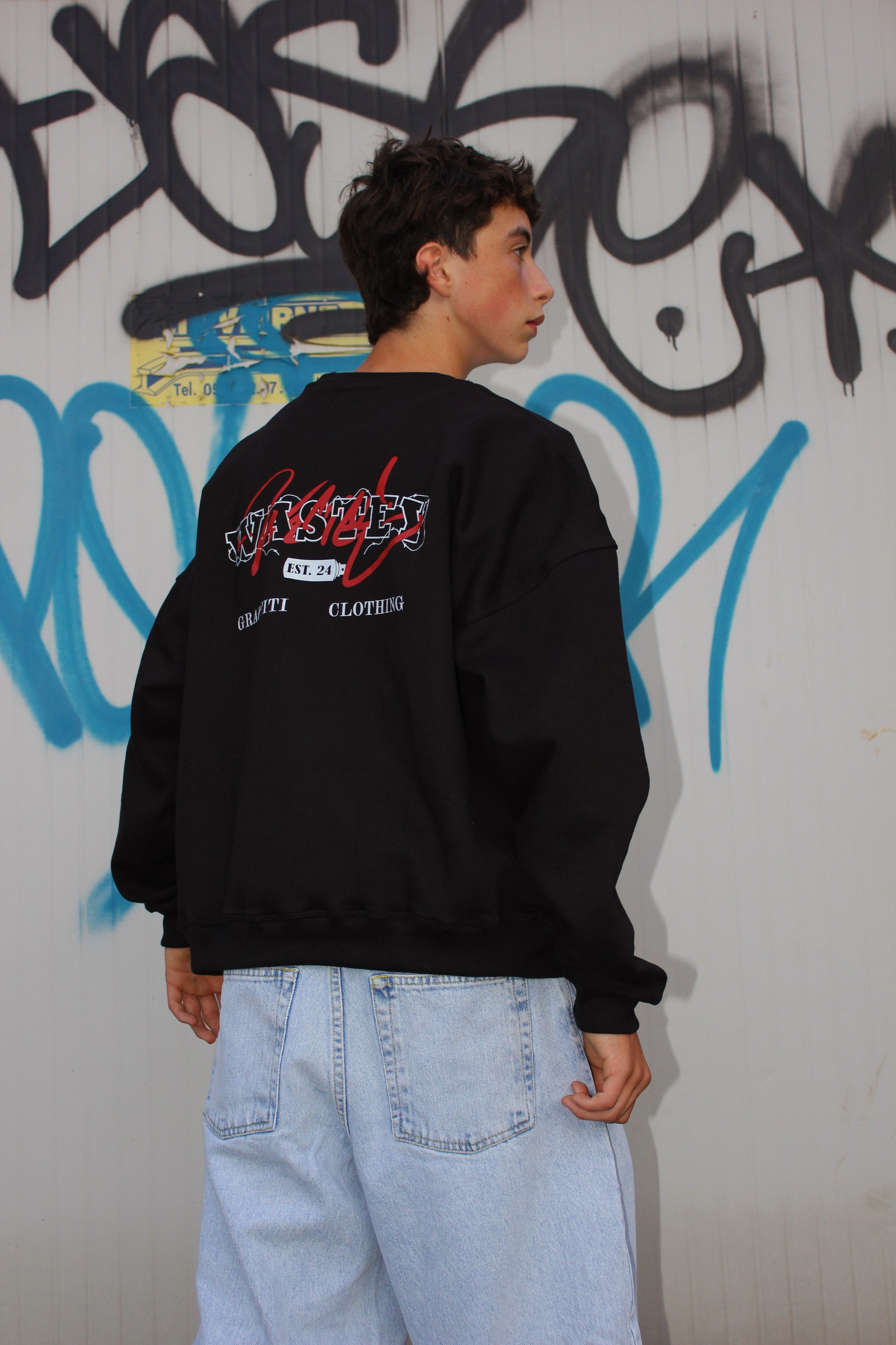 Baggy sweater die kort valt, goed voor onder uitkomende T-shirt. Backprint en klein Wastey logo op de voorkant.